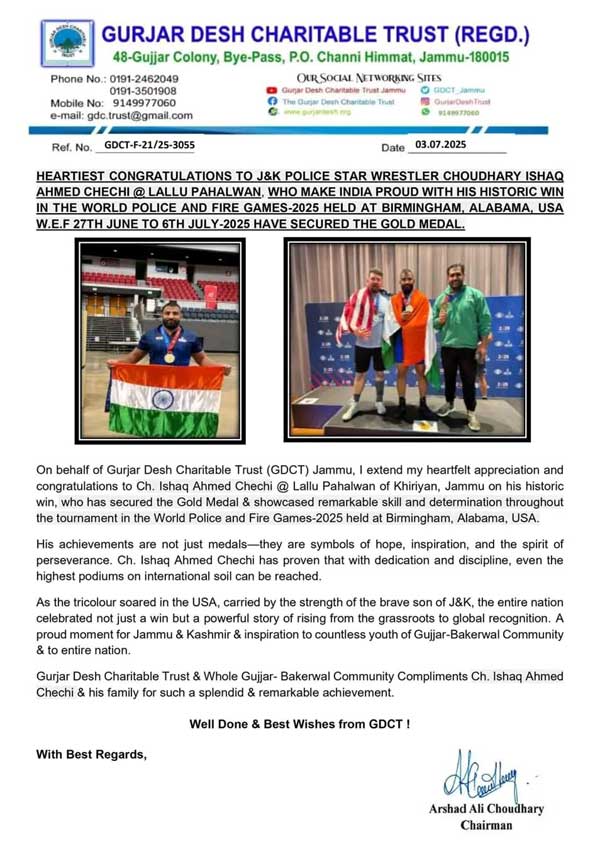 A Condolence meeting was held on 25-12-2025 at GDCT complex, under the Chairmanship of Jenab Arshad Ali Choudhary, Chairman GDCT accompanied by Er. Mohammad Sadiq Azad, General Secretary, Jb. Hashim Ali, Sr. Trustee, Jb. Bashir Ahmed Noon, Financial Advisor, Jb, Asif Khaliq Poswal, Secretary, Jb. Shouket Javed, Sr. Trustee, Adv. Shah Mohammad Chowdhary, Sr. Trustee, Jb. Farooq Alam, Sr. Trustee, Jb. Yousaf Khepar, Sr. Trustee, Jb. Sajad Majeed Chechi, Sr. Trustee, Jb. Showkat Perwez Chechi, Sr. Trustee, Jb. Hamid Hussain, Sr. Trustee, Jb. Mohammad Rafiq Kohli, Sr. Trustee, Jb. Mohammad Amin Choudhary, Trustee, Jb. Bashir Ahmed Khatana, Sr. Trustee, Jb. M.S. Chouhan, Sr. Trustee, Adv. Aslam Khan, Sr. Trustee, Er. Taj Chowdhary, Sr. Trustee, Adv. Anwar Chowdhary, Trustee, Jb. Anjar Rana, Trustee, Adv. Zulkarnain Chowdhary, Trustee & Staff to pay floral tribute to our beloved Haji Ali Hussain Hakla Sahib, Former Chairman and Senior Trustee of Gurjar Desh Charitable Trust who got expired on 21-12-2025 (Sunday). All the Esteemed Trustees of GDCT shared their valuable time and memories with Haji Ali Hussain Hakla Sahib. The passing away of Hakla Sahib is an irreparable loss to GDCT and to the entire community. He was a noble soul, a committed social worker, and a guiding force whose contributions, wisdom, and dedication to GDCT and to the cause of community welfare shall always be remembered with respect and gratitude. May Almighty Allah grant him the highest place in Jannat-ul-Firdaus and give strength, patience, and fortitude to the bereaved family to bear this immense loss. Inna Lillahi wa Inna Ilaihi Raji‘oon.